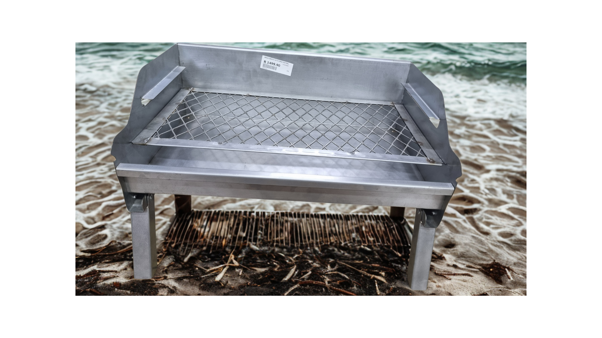 This Braai Beach grill features durable stainless steel construction and convenient foldable legs for easy transport and storage.