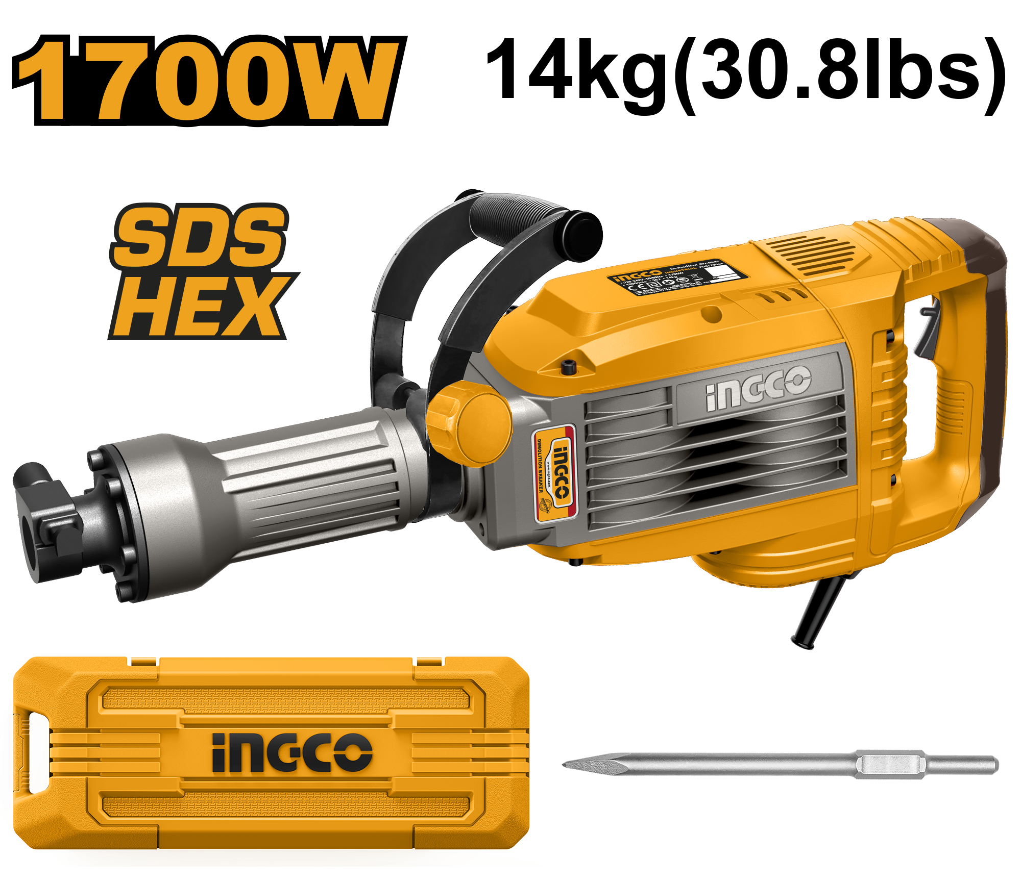 1700W motor! Breaks concrete fast! Includes 1 chisel + case! Professional demolition at budget price!